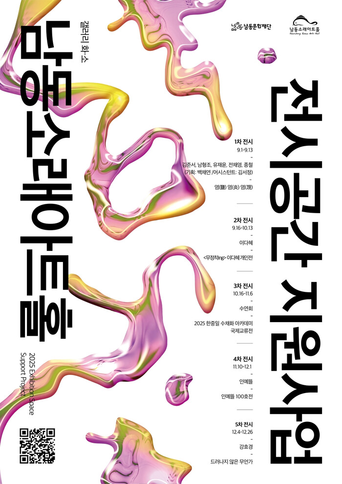[인천=문찬식 기자] 인천 남동구 남동문화재단은 ‘2025년 갤러리 화·소 전시공간지원사업’의 선정작에 대한 릴레이 전시회를 9월부터 연말까지 총 5차례에 걸쳐 진행한다고 밝혔다.