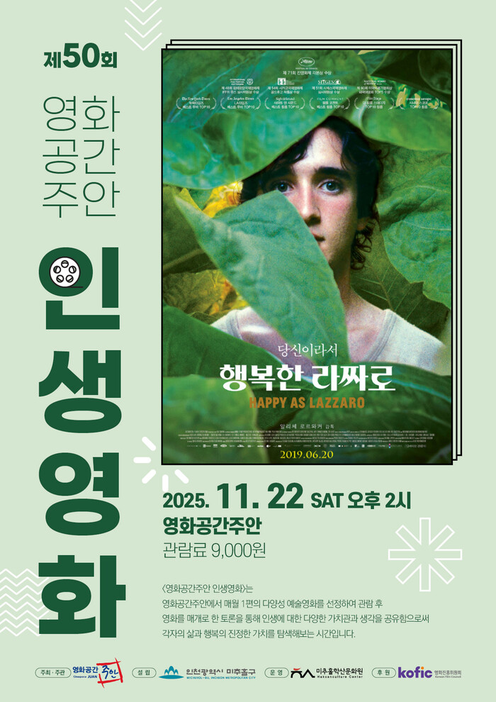 한편, 영화공간주안이 운영하는 ‘인생 영화’ 프로그램은 매월 한 편의 다양성·예술영화를 선정해 상영한 뒤, 관객과의 토론을 통해 삶과 행복의 가치와 의미를 함께 탐색하는 참여형 프로그램으로, 지역민들이 영화로 소통하고 성찰할 수 있는 대표 독립 예술영화 프로그램으로 자리 잡고 있다.