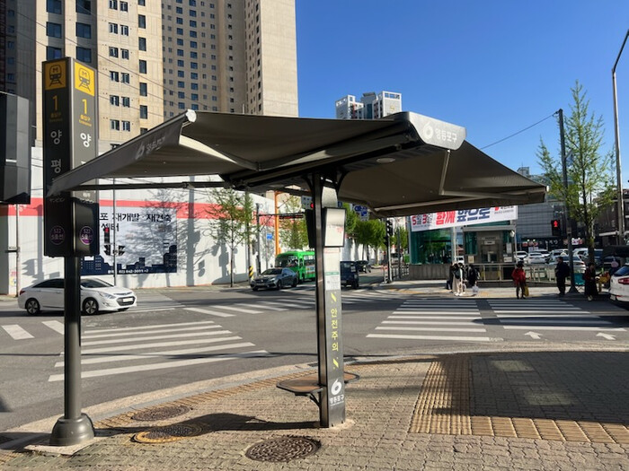 | ▲ 양평역 교차로에 설치된 스마트 그늘막. (사진=영등포구청 제공) |