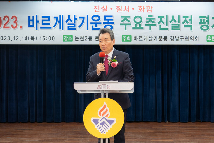 | ▲ 최근 진행된 “2023 바르게살기운동 강남구 평가보고대회”에서 김형대 의장이 축사를 하고 있다. (사진=강남구의회 제공) |