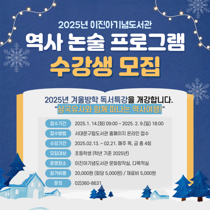 [시민일보 = 이대우 기자] 서대문구도시관리공단(이사장 한운영)이 운영하는 이진아기념도서관에서 오는 2월 13일(목)부터 2월 21일(금)까지 2주(1주 2회, 총 4회차) 동안 어린이(초등학생)을 대상으로 하는 2025년 겨울방학 독서 특강 “삼국유사와 함께 떠나는 역사여행” 참여자를 모집한다.