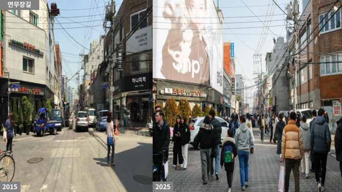 | ▲ 10년 전 성수동(왼쪽 사진)과 2025년 현재(오른쪽 사진)의 성수동을 비교한 모습. (사진=성동구청 제공) |