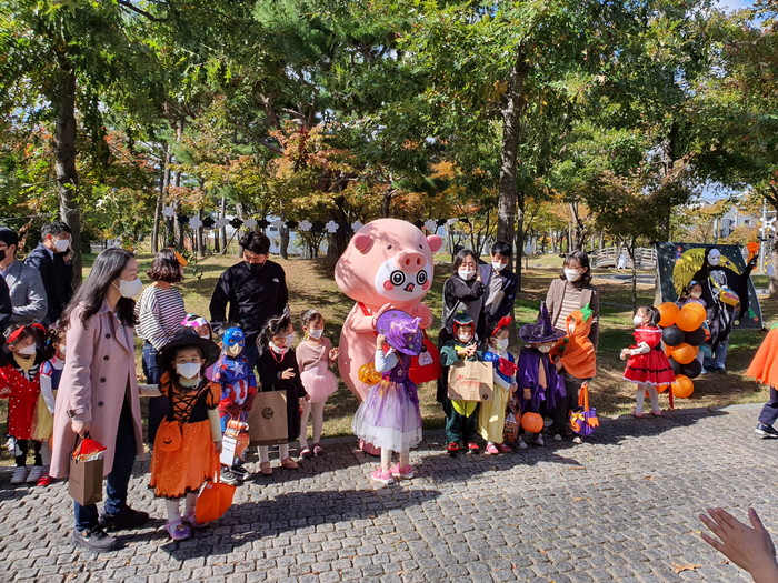 | ▲ 지난달 열린 할로윈 행사에서 '굿바비'가 참가 어린이들과 함께 즐거운 시간을 보내고 있다. (사진제공=밀양시청) |
