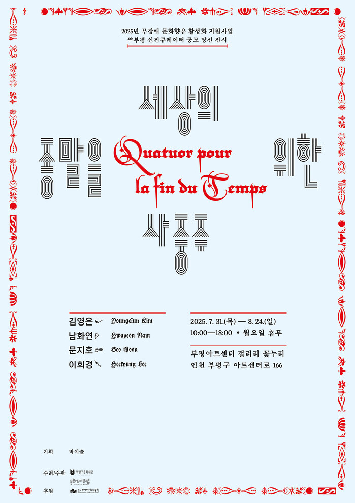 [인천=문찬식 기자] 인천 부평구(구청장 차준택) 문화재단은 오는 24일까지 부평아트센터 갤러리꽃누리에서 제4회 부평 신진 큐레이터 공모 당선 전시 ‘세상의 종말을 위한 사중주’를 개최한다.