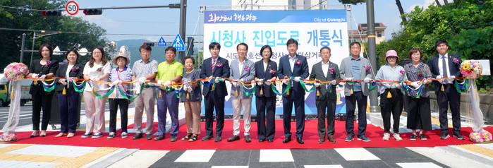 경기 광주시는 지난 4일 시청사 진입도로인 시도 29호선 도로 확·포장공사를 완료하고 광주시청 정문 사거리부터 회덕동 삼거리까지 총연장 980m, 4차선 도로를 전면 개통했다. 사진은 이날 개통식에서 방세환 시장(오른쪽 여섯 번째)과 관계자들이 테이프 커팅을 하는 모습. (사진제공=광주시청)