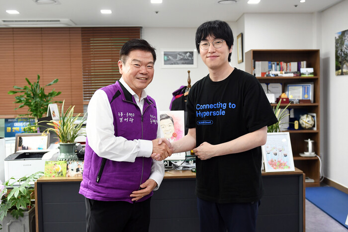 | ▲ 구청을 방문한 하정우 네이버클라우드 AI 이노베이션 센터장(오른쪽)과 기념 촬영하는 이필형 구청장(왼쪽). (사진=동대문구청 제공) |