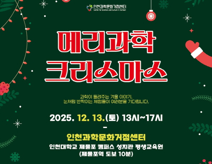 이번 축제는 인천대학교 제물포캠퍼스 성지관 평생교육원에서 13시부터 17시까지 진행될 예정이며 시민들이 과학과 함께 따뜻한 연말을 보낼 수 있도록 기획됐다. '메리과학크리스마스' 축제는 1년간 인천과학문화거점센터에서 선보였던 인기 체험 프로그램들을 한자리에 모아 선보인다.