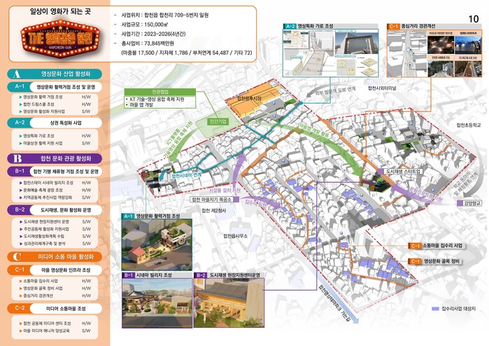 합천읍 내 좁고 오래된 골목길은 어둡고 지저분해 주민들의 불안감을 조성한다. 보행환경을 정비하고, 스마트 가로등을 설치해 골목을 밝힌다. 또한 그간 합천에서 촬영된 영화, 드라마, 수려한 합천 영화제 수상작 등을 홍보할 수 있는 시설물을 설치해 주민의 안전을 지키고 관광객들에게 볼거리도 함께 제공한다.