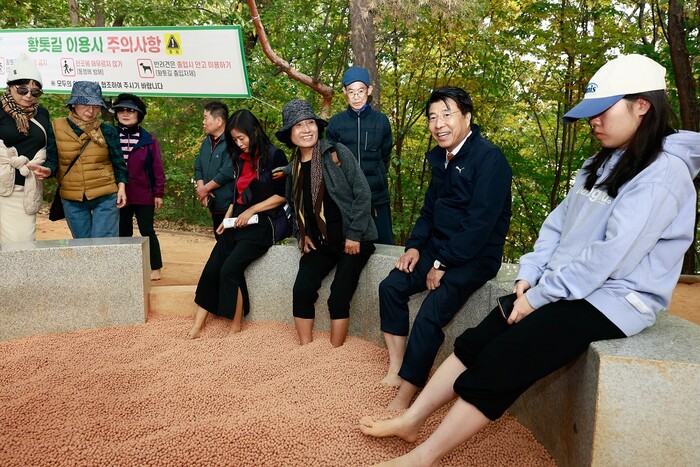 | ▲ 맨발걷기 황토체험존을 방문한 서강석 구청장(오른쪽 두 번째)이 주민들과 함께 체험을 하며 담소를 나누고 있다. (사진=송파구청 제공) |