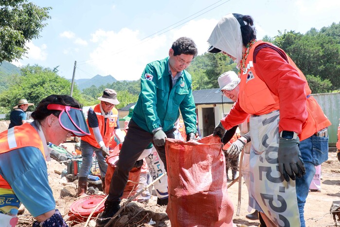 | ▲ 이상일 용인특례시장이 25일 가평군의 수해복구 현장에서 용인시자원봉사센터의 '레디용 봉사단'과 함께 피해복구 작업을 진행 중이다. |