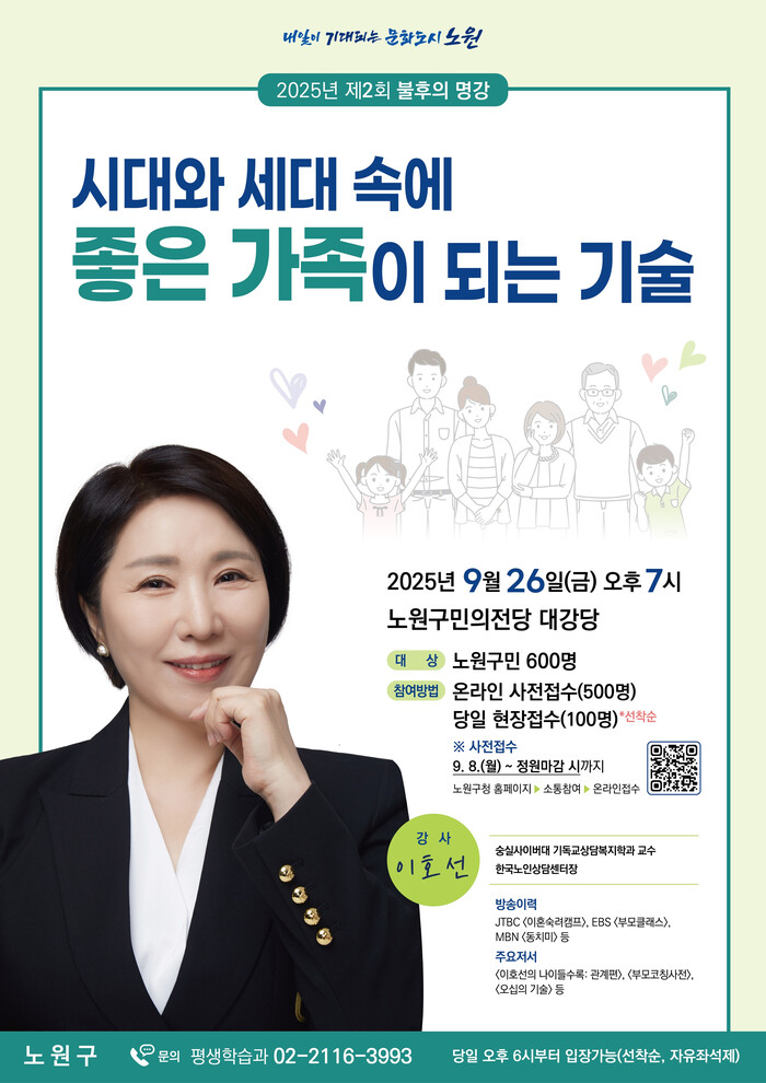 노원구민의전당 대강당에서 진행되는 제2회 불후의 명강 주제는 ‘시대와 세대 속에 좋은 가족이 되는 기술’이다. 빠르게 변화하는 시대 속에서 가족 구성원 간의 갈등과 오해, 단절을 넘어 공감과 회복으로 나아가는 과정을 따뜻하고도 유쾌하게 풀어낼 예정이다.