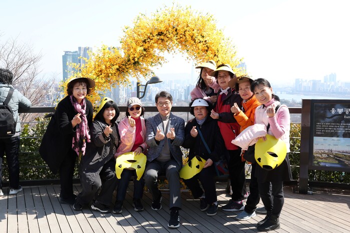 | ▲ 지난해 ‘응봉산 개나리 축제’에서 정원오 성동구청장(사진 가운데)이 주민들과 함께한 모습. (사진=성동구청 제공) |