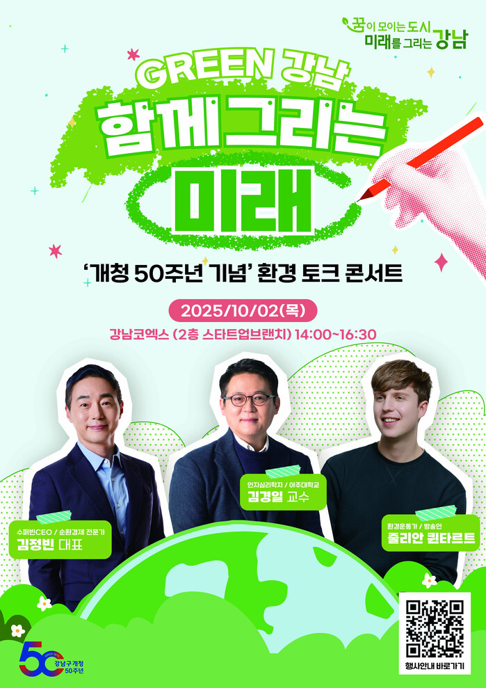 조성명 구청장은 “이번 환경 토크 콘서트는 강남 50년의 성장을 돌아보는 동시에, 미래세대를 위한 지속가능한 도시 전략을 함께 고민하는 자리”라며 “앞으로도 주민, 기업, 전문가가 함께하는 협력 모델을 통해 탄소중립 도시 강남을 실현하고, 기후위기 대응을 선도하는 글로벌 도시로 나아가겠다”고 밝혔다.