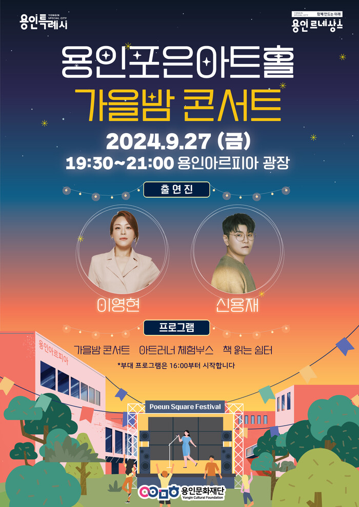 [용인=오왕석 기자] 용인문화재단(이사장 이상일)은 오는 9월 27일 용인포은아트홀 앞 야외 광장에서 책도 읽고 발라드도 즐길 수 있는 ‘용인포은아트홀 가을밤 콘서트’를 개최한다.