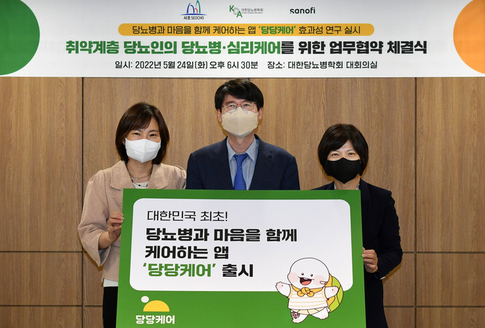 서울 서초구가 지난 24일 대한당뇨병학회·(주)사노피-아벤티스 코리아와 지역내 취약계층 당뇨병 환자를 위해 ‘당당케어’ 프로젝트 업무협약을 체결했다. 구는 연구 참여할 당뇨병 환자 모집·관리를, 대한당뇨병학회는 당뇨·심리케어를 위한 앱 콘텐츠 개발 지원과 의학적 자문을, 사노피는 앱 콘텐츠 개발 등 프로젝트 전반을 운영한다. 사진은 협약식에서 관계자들이 기념촬영을 하는 모습. (사진제공=서초구청)