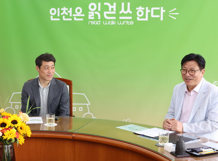 | 이용창 위원장(왼쪽)과 인천시교육감이 학교시설 개방에 대한 의견을 나누고 있다. |