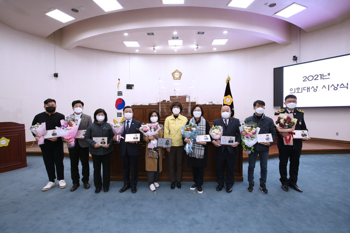 | ▲ 하남시의회는 1일 열린 정례회 개회식에서 ‘2021년 하남시 의회대상’ 9명을 선정, 시상식을 열고 수상자들을 격려했다. (사진제공=하남시의회) |