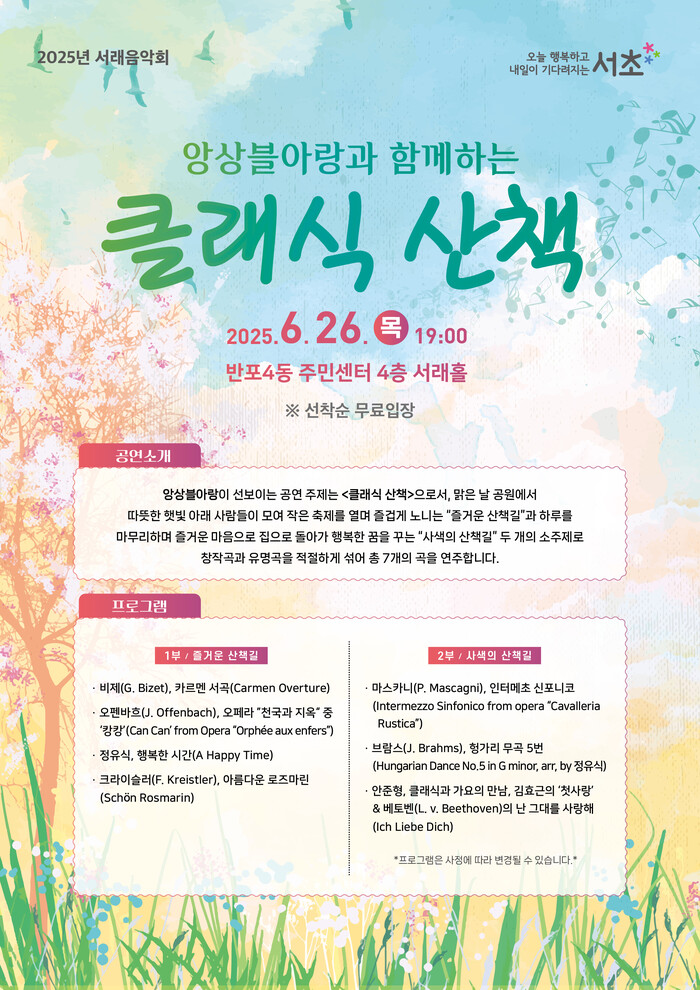 약 1시간 진행되는 ‘앙상블아랑과 함께하는 클래식 산책’은 선착순 무료입장으로, 음악을 사랑하는 누구나 자유롭게 관람할 수 있다. 자세한 사항은 반포4동주민센터로 문의하면 된다.