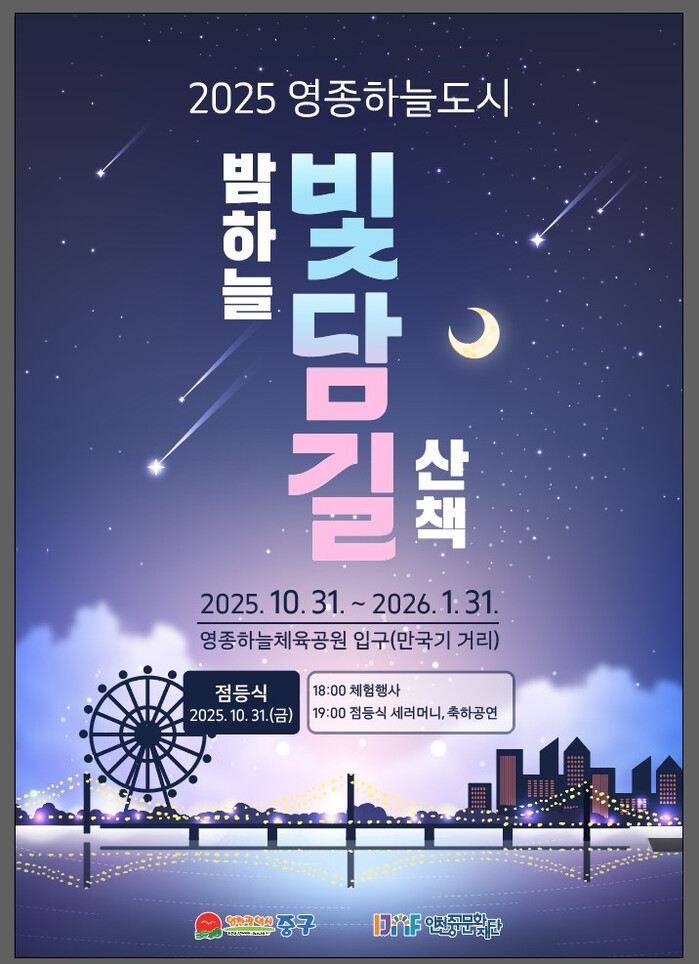 [인천=문찬식 기자] (재)인천중구문화재단(이사장 김정헌)은 올해 10월 31일부터 오는 2026년 1월 31일까지 3개월간 야간 경관조명 ‘2025 영종 빛 축제 - 영종하늘도시 밤하늘 빛담길’을 운영한다고 밝혔다.