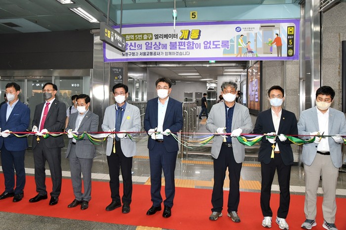오승록 서울 노원구청장은 12일 노원역 5번출구 엘리베이터 준공식에 참석했다. 설치된 엘리베이터는 노원역 5번출구 인근 신한은행 앞에 위치해 있으며, 24인승으로 지상층과 지하 1층 간 운행한다. 사진은 개통식에 참석한 오 구청장(오른쪽 네 번째)이 관계자들과 테이프 커팅을 하고 있는 모습. (사진제공=노원구청)