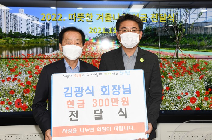 서울 노원구는 9일 개인기부자 김광식씨로부터 2022 희망온돌 따뜻한 겨울나기와 관련해 지역내 저소득계층을 위한 성금 300만원을 기부받았다. 사진은 전달식에서 오승록 구청장(오른쪽)과 김씨가 기념촬영을 하는 모습. (사진제공=노원구청)