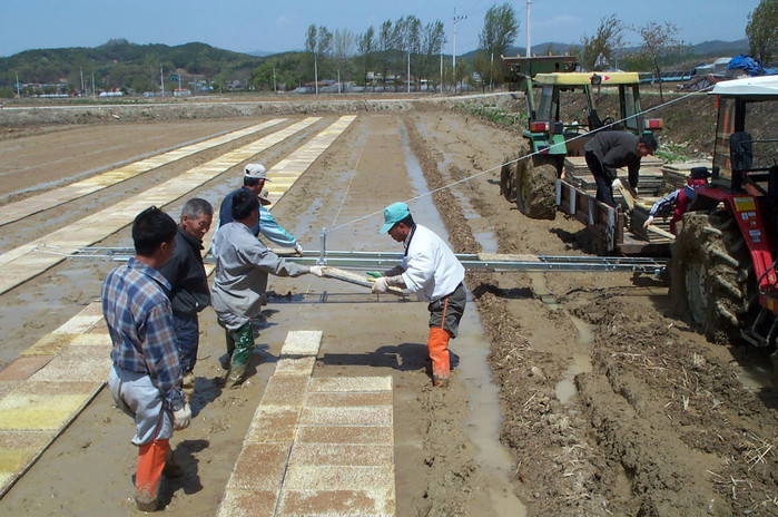 이때 부직포에 흙을 너무 많이 누르면 모가 자랄 때 부직포가 들리지 않아 피해를 입을 수 있으므로 바람에 날리지 않을 정도만 눌러주고 본잎 3매를 기준으로 부직포를 벗겨주고, 지역별 기상을 감안해 저온 피해에 대비하면 된다.