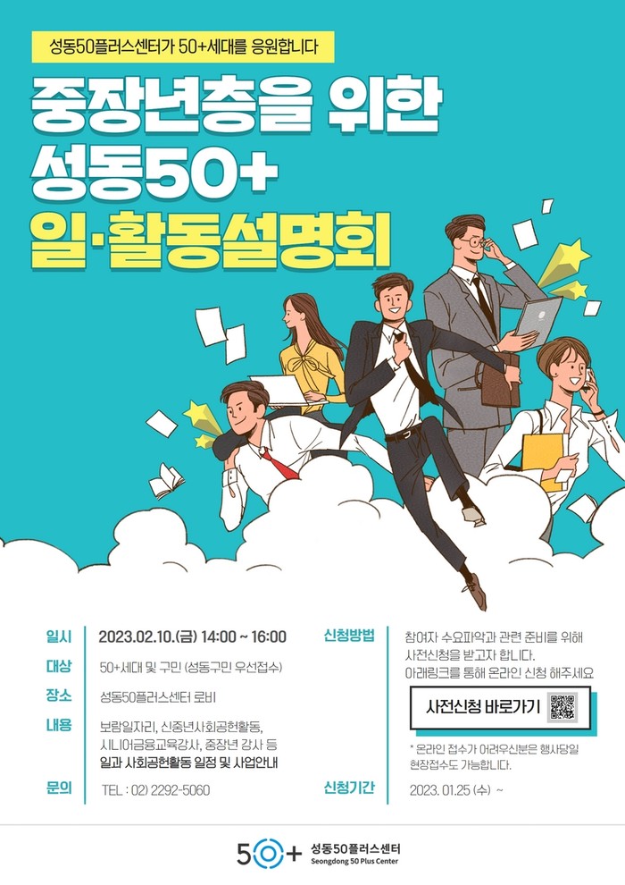 성동50플러스센터는 생애 전환기를 맞은 50+세대 중장년층이 새로운 도전을 할 수 있도록 지원하는 기관으로, 이번 일·활동 설명회는 오는 10일 금요일 오후 2~4시 성동50플러스센터 메인홀에서 개최된다.