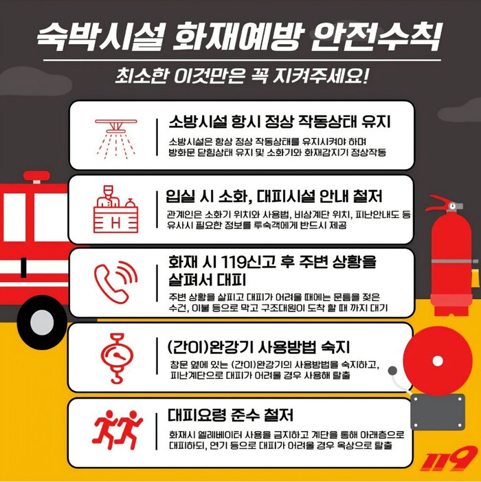 특히 작년 부천 숙박시설 화재와 같은 유사사례가 반복되지 않도록 철저한 사전점검과 경각심이 중요하다고 밝혔다.