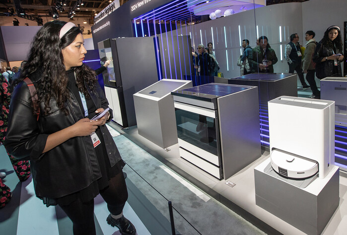 | ▲ CES 2024이 열리고 있는 미국 라스베이거스 컨벤션 센터 삼성전자 전시관에서 관람객들이 '비스포크 재트 봇 콤보'를 구경하고 있다.(사진=삼성전자 제공) |