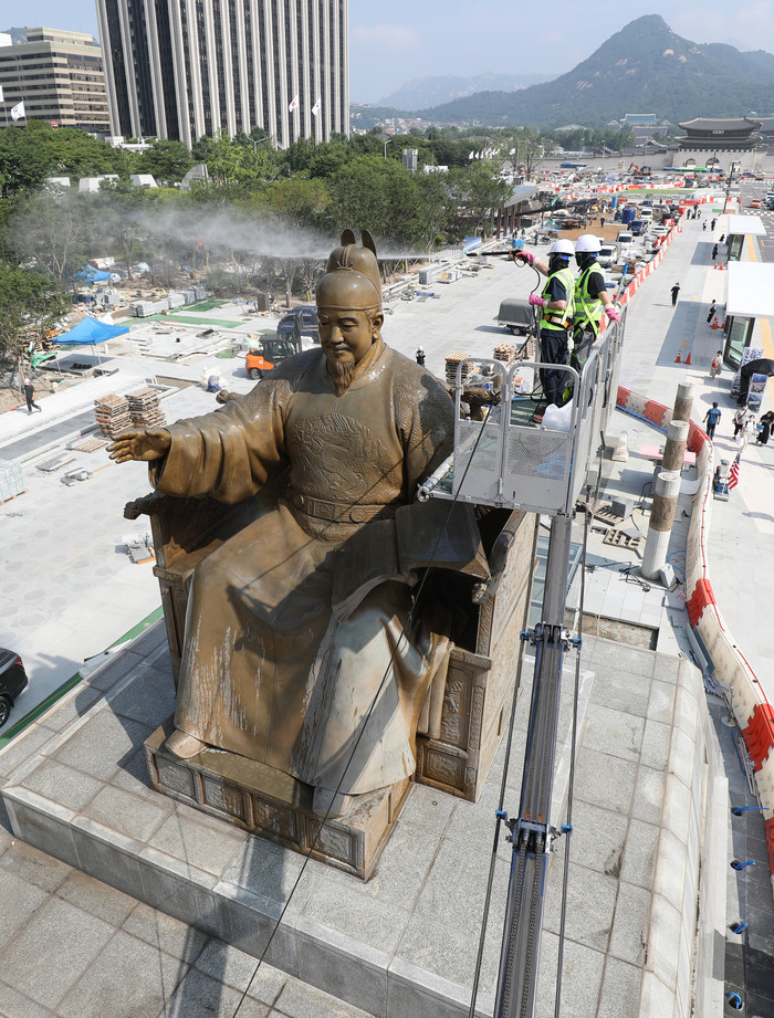 광화문광장 재조성 공사가 한창인 가운데 18일 오전 세종대왕상의 묵은 때를 벗겨내는 세척 작업이 진행되고 있다.