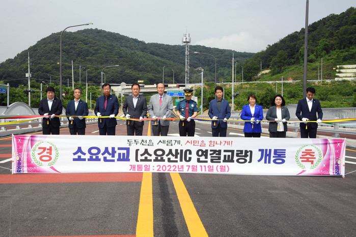 경기 동두천시가 11일 소요산교(소요산IC 연결교량)를 개통했다. 이날 교량 개통에 앞서 박형덕 시장, 김승호 시의장을 비롯한 시의원 및 도의원, 동두천경찰서장 등이 참석해 안전점검을 시행했다. 사진은 박 시장(왼쪽 다섯 번째), 김 의장(왼쪽 네 번째)등 테이프 커팅을 하고 있는 모습. (사진제공=동두천시청)