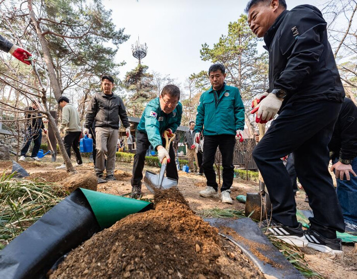 | ▲ 제80회 식목일을 맞아 김경호 구청장과 직원들이 아차산에서 나무를 식재하고 있다.(사진=광진구청 제공) |