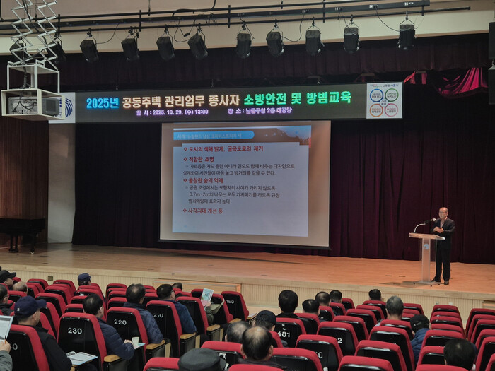 [인천=문찬식 기자] 인천 남동구는 최근 구청 대강당에서 의무관리대상 공동주택 관리업무 종사자를 대상으로 2025년 공동주택 소방안전 및 방범 교육을 했다고 밝혔다.