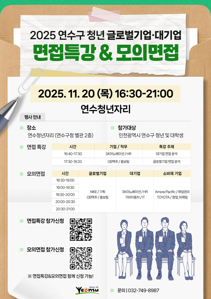 참여 신청은 연수청년자리 누리집을 통해 할 수 있으며, 자세한 사항은 연수구 일자리정책과로 문의하면 된다.