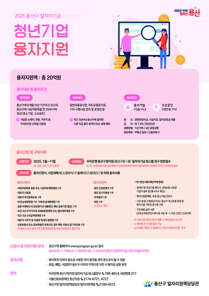 [시민일보 = 문민호 기자] 용산구(구청장 박희영)는 일자리기금 사업의 일환으로 20억원 규모의 ‘2025년 청년기업 융자지원’을 실시한다고 31일 밝혔다.