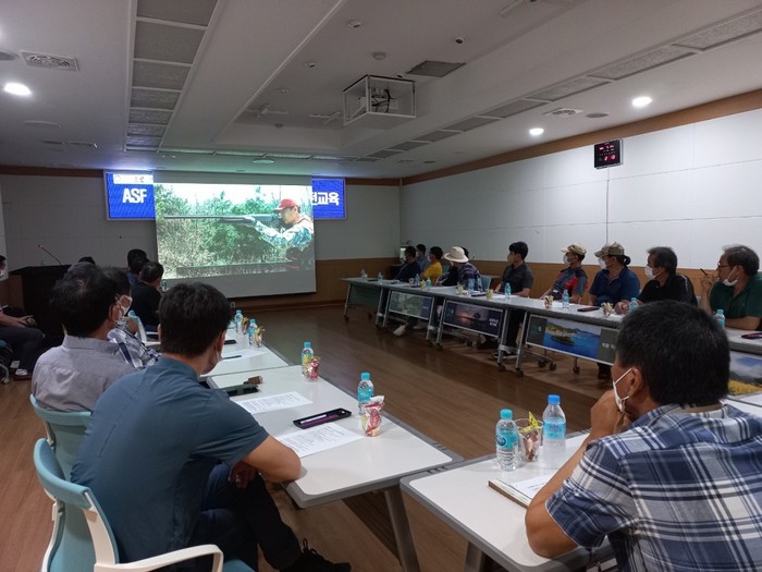 | ▲ 강진군, 지난 21일 야생동식물 관리연합회 임원 및 피해방지단 회원을 대상으로 수확기 피해방지단 총기 안전교육 및 아프리카 돼지열병 대응강화 현안 회의 개최 / 강진군 제공 |