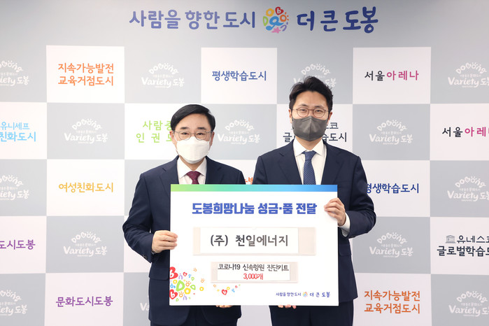 서울 도봉구는 16일 (주)천일에너지로부터 코로나19 신속항원 진단키트 3000개를 후원받았다. 이번 후원은 지역내 코로나19 확산을 막고, 경영이익을 지역 주민에게 환원하고자 마련됐다. 사진은 전달식에서 이동진 구청장(왼쪽)이 관계자와 기념촬영을 하는 모습. (사진제공=도봉구청)
