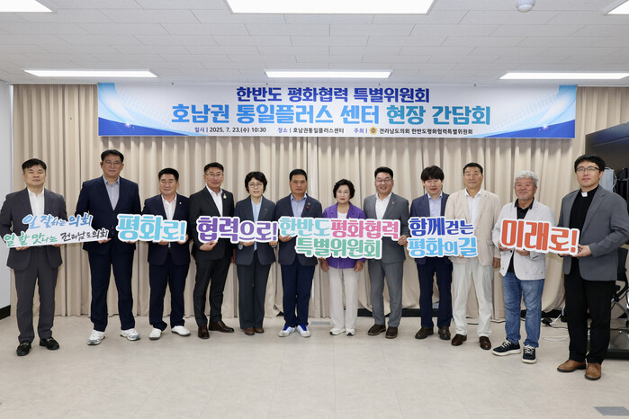 [남악=황승순 기자] 전남도의회 한반도 평화협력 특별위원회가 23일 목포시에 위치한 호남권 통일플러스센터를 방문해 첫 현장 간담회를 열고, 남북교류협력 활성화 방안 등에 대해 논의했다.
