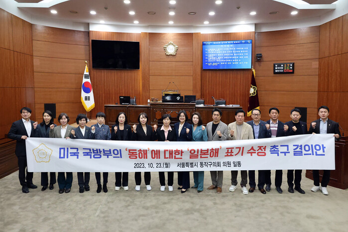 | ▲ 미국 국방부의 '동해'에 대한 '일본해' 표기 수정 촉구 결의안을 채택한 동작구의원들이 기념촬영을 하고 있다. (사진=동작구의회 제공) |