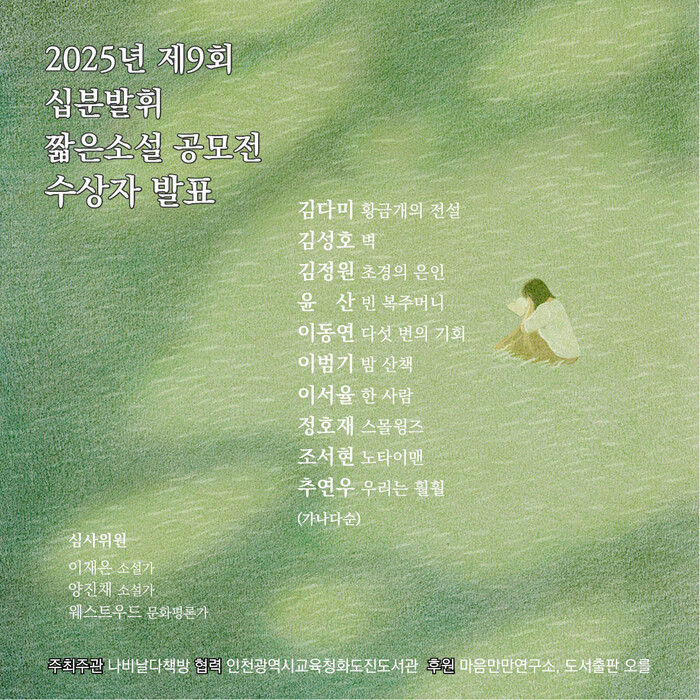 [인천=문찬식 기자] 인천광역시교육청화도진도서관(관장 박은정)은 배다리 지역서점 ‘나비날다책방’이 주관하고 화도진도서관이 협력한 2025년 제9회 ‘십분발휘 짧은 소설 공모전’ 수상자를 10일 발표했다.