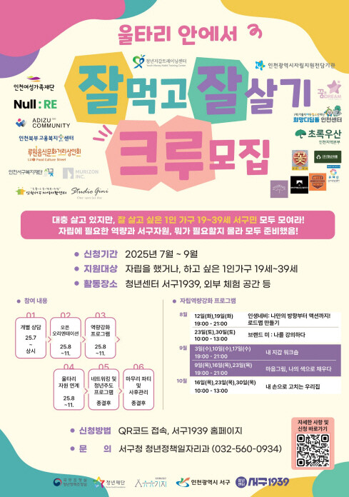 [인천=문찬식 기자] 인천 서구(구청장 강범석)는 십시일반 청년사랑 울타리 협의체(이하‘청년사랑 울타리’)를 구성하여, 1인 가구 청년 맞춤형 지원 사업인 ‘울타리 안에서 잘 먹고 잘 살기’ 참여자(잘잘크루)를 모집한다고 13일 밝혔다.
