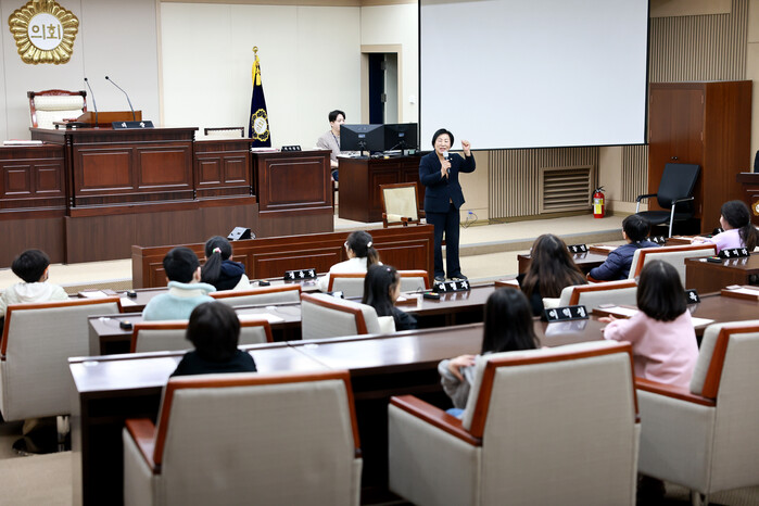 최근 인천 부평구의회가 부평동초등학교 3학년 학생 170명을 대상으로 견학·체험 프로그램을 실시했다. 사진은 본회의장에서 구의회의 기능과 구의원의 역할 등 대해 진행자의 설명을 듣고 있는 학생들의 모습. (사진=부평구의회 제공)