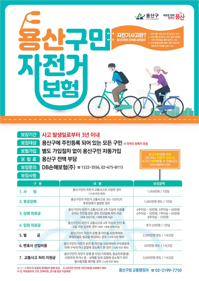 이와 함께 구는 주민들의 안전한 자전거 이용을 돕기 위해 '용산구민 자전거 보험'도 운영하고 있다. 구에 주민등록이 돼 있는 주민(등록외국인 포함) 누구나 자동으로 가입되며, 전국 어디에서 사고가 발생하더라도 보험 혜택을 받을 수 있다.