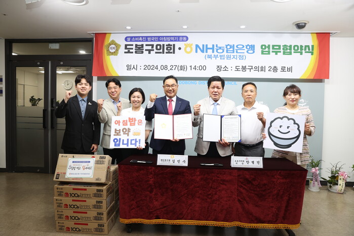 [시민일보 = 문민호 기자] 서울 도봉구의회(의장 안병건)가 최근 도봉구의회 2층 로비에서 NH농협은행 북부법원지점과 ‘아침밥 먹기’ 캠페인 활성화를 위해 업무협약을 체결했다고 2일 밝혔다.