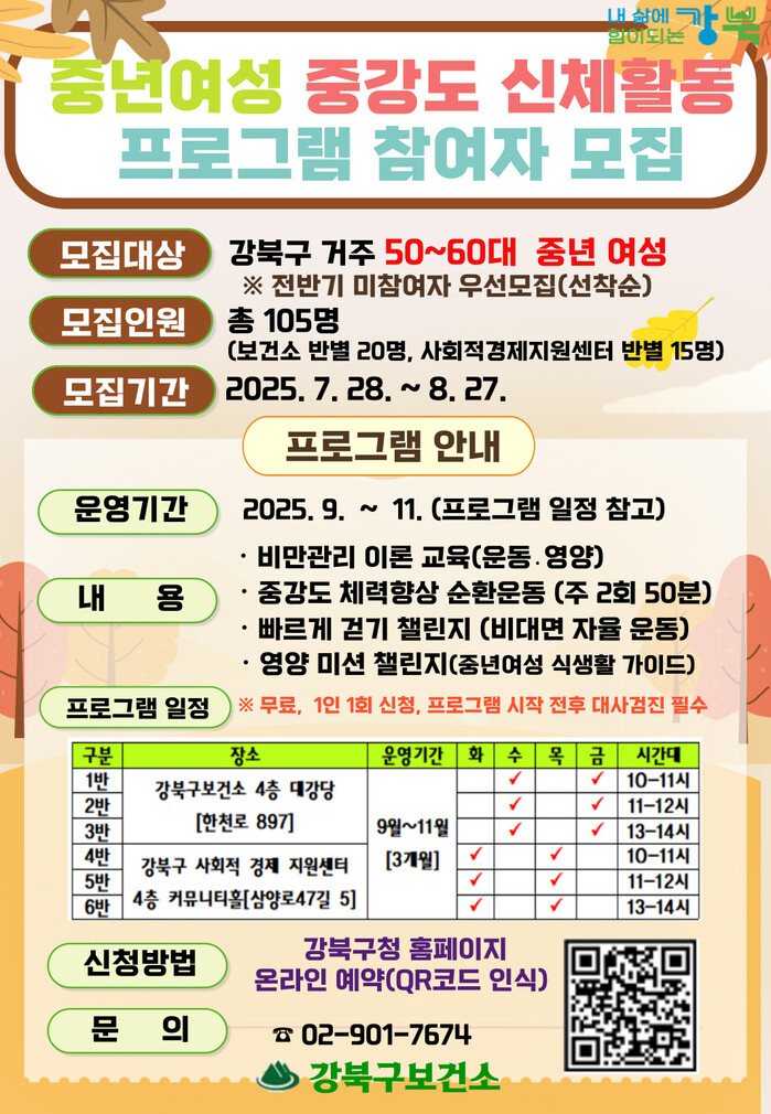 [시민일보 = 문민호 기자] 강북구(구청장 이순희)는 중년여성의 건강 증진을 위해 ‘중강도 신체활동 프로그램’ 참여자를 모집한다고 25일 밝혔다.