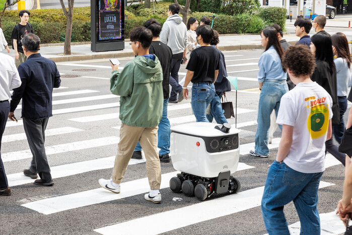 | ▲ 사람들과 함께 횡단보도를 건너고 있는 실외배달로봇. (사진=강남구청 제공) |