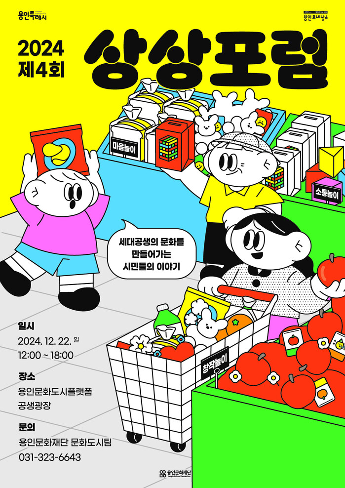 올해로 4회를 맞이한 ‘상상포럼’은 매년 문화도시 사업 성과를 공유하고, 포럼에서 발견된 의제를 차년도 사업으로 환류하는 문화도시 용인의 대표 브랜드 사업으로 금년에는 지속 가능한 문화도시를 꿈꾸는 30명의 문화도시 활동가가 ‘세대 공생’을 주제로 기획한 문화상품 실험 프로젝트 <00의 상상은 현실이 된다> 사례를 중점으로 다룬다.