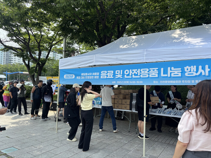 [인천=문찬식 기자] 인천 남동구는 최근 인천문화예술회관 주차장에서 쿠팡이츠 서비스와 협업해 배달업 종사자 200여 명을 대상으로 온열질환 예방을 위한 음료 및 안전용품 나눔 행사를 개최했다고 전했다.