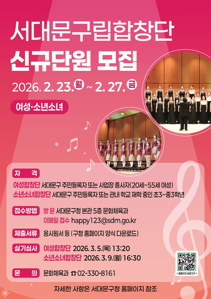 | ▲ 2026년 서대문구립(여성·소년소녀)합창단 신규 단원 모집 포스터. (사진=서대문구청 제공) |