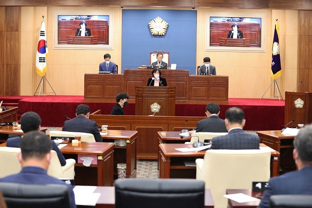| ▲ 노영미 영암군의원이 지난 23일 열린 제1차 본회의에서 "위드코로나를 맞이하는 우리들의 자세"와 선제적 대응체계 구축을 촉구하는 5분 발언을 하고 있다. / 사진=영암군의회 제공 |